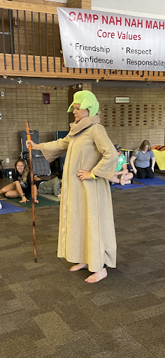 I am dressed as Aunt Yogi, Yoda’s great aunt. She is 7000 years old and needs to take naps every 10 minutes. The theme is Star Wars, if you hadn’t caught on, and soon I am being educated by nine and 10 year olds about Star Wars history as I progress through my yoga lesson plan! Maintaining character as Aunt Yogi, I assure the campers in my affected, high-pitched voice that I would look into my family history to find out specifics about my Jedi training protocol.