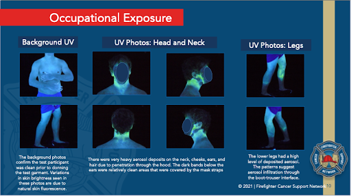 As demonstrated in the video with the side-by-side living rooms, the smoke-engulfed burning synthetic room is filled with toxic free radical hydro-carbons, which form into carcinogenic substances that eventually get absorbed through the skin of the firefighter.